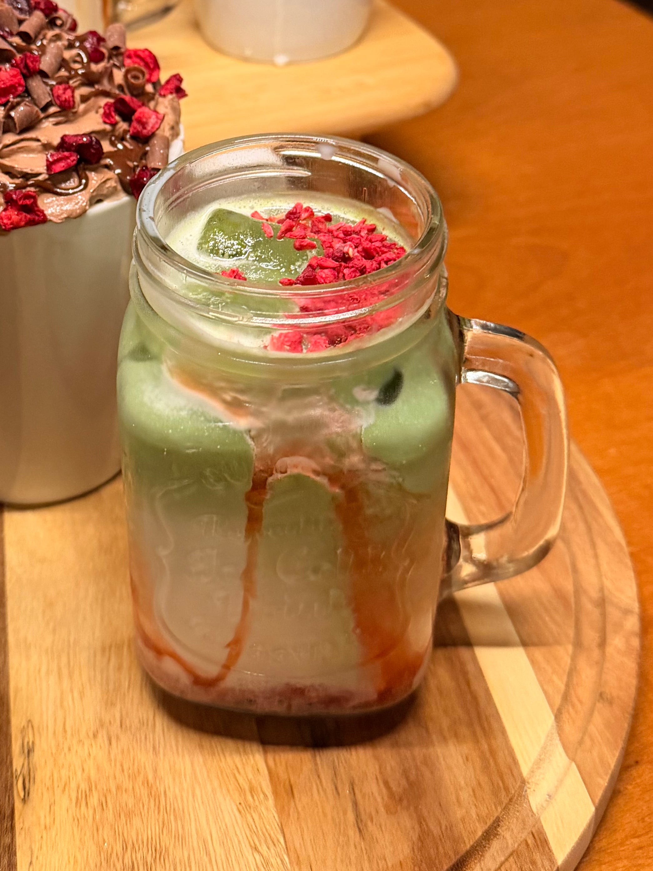 Strawberry & white chocolate flavoured matcha latte topped with freeze dried raspberries!