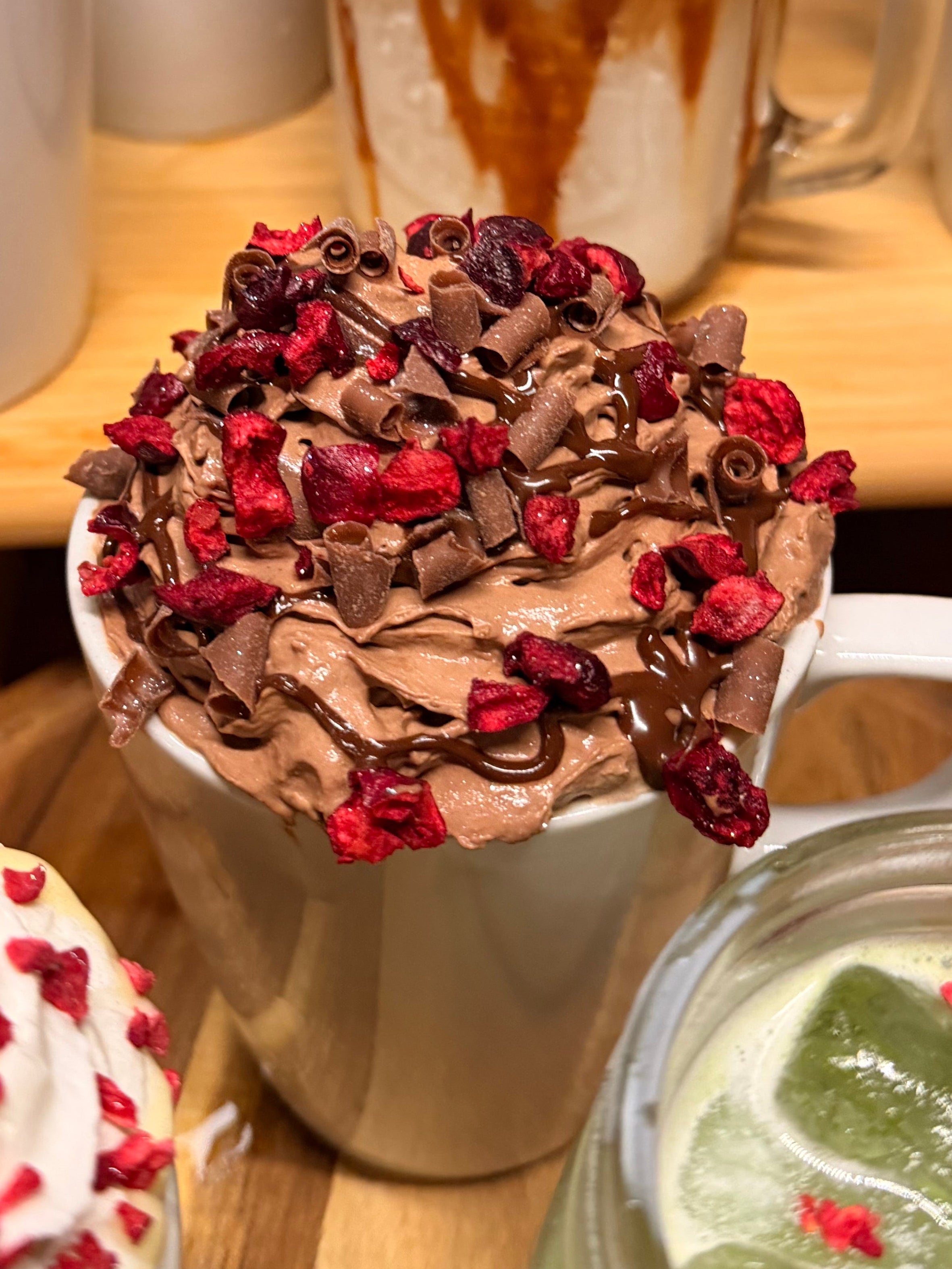 Cherry flavoured mocha topped with chocolate cream, chocolate sauce, chocolate curls, freeze dried cherries & edible glitter!