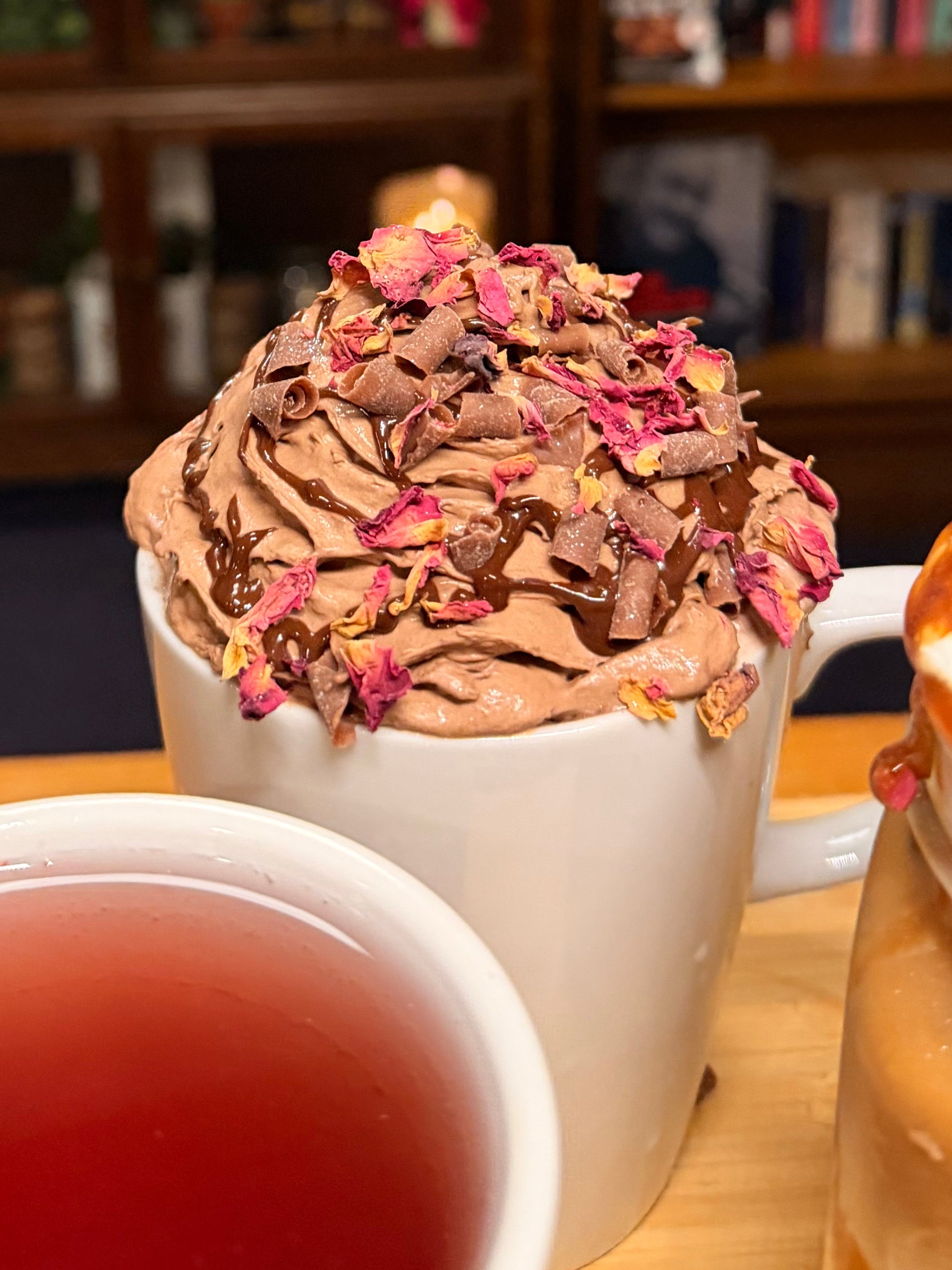 Rose flavoured hot chocolate topped with chocolate cream, chocolate sauce, chocolate curls, rose petals & edible glitter!