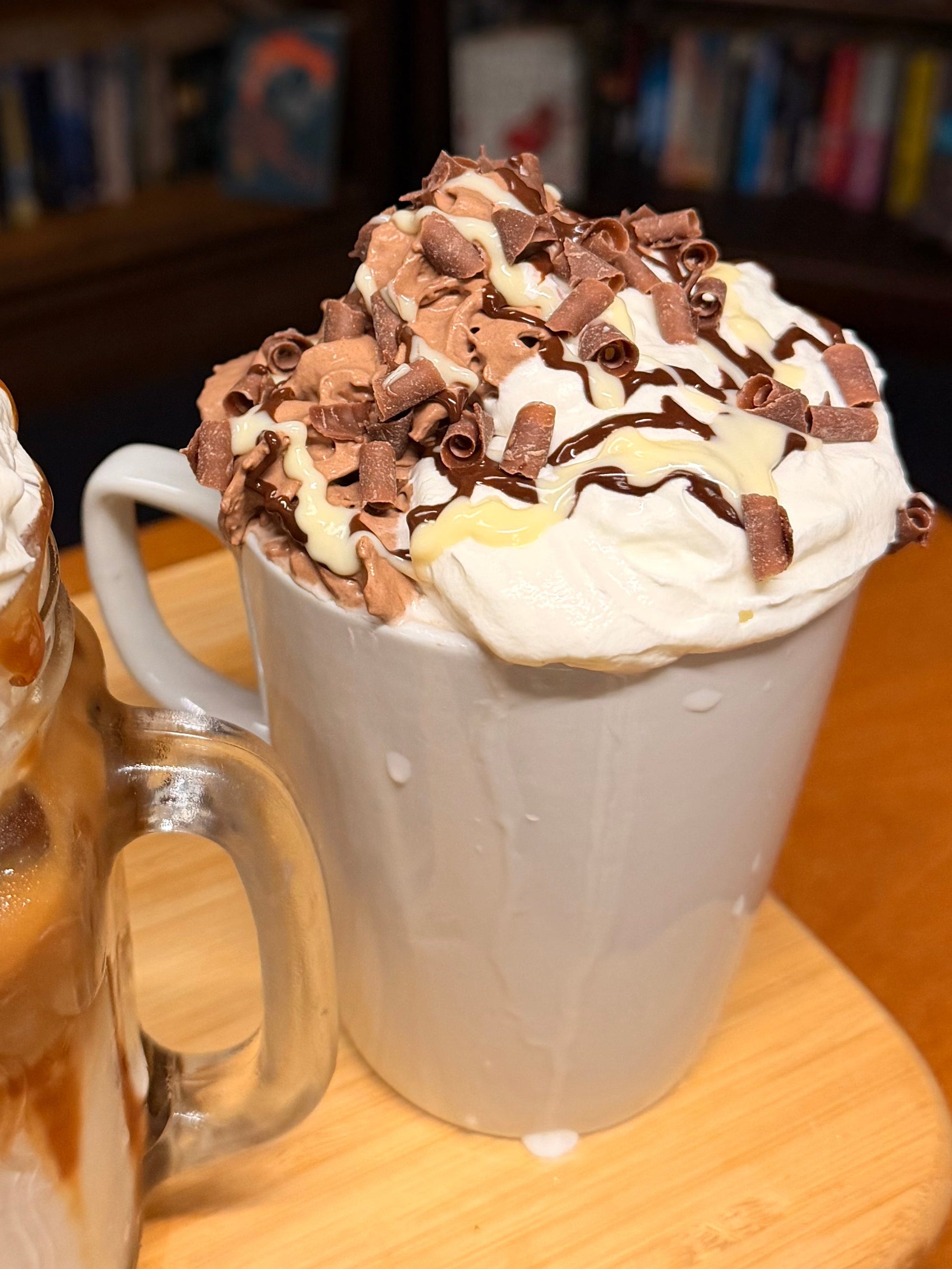 White & milk chocolate flavoured mocha topped with chocolate & white cream, milk & white chocolate sauce & chocolate curls!