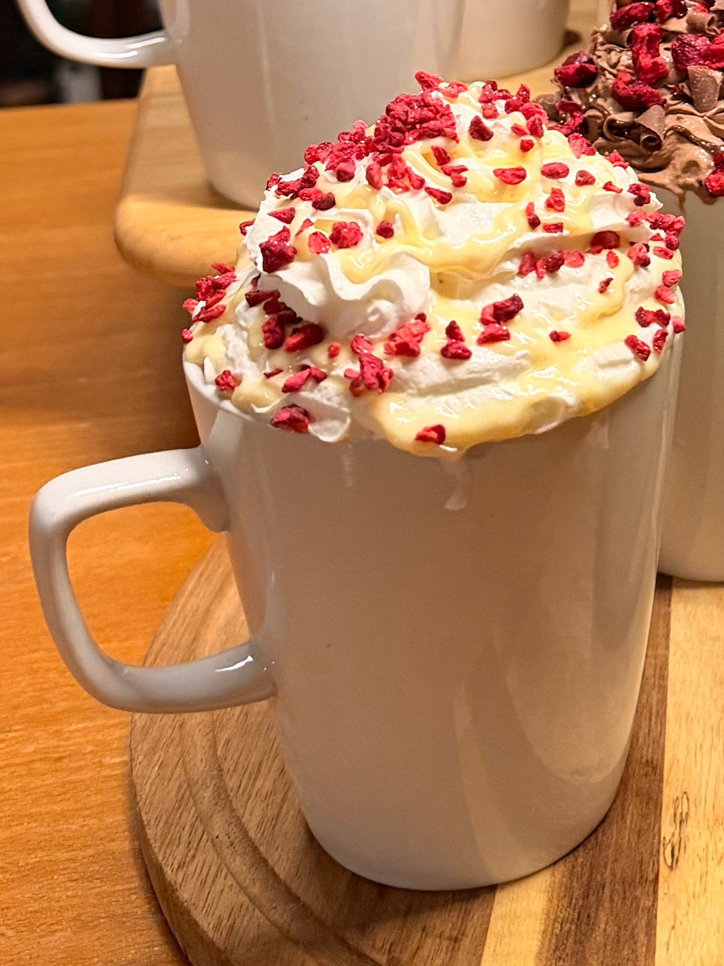 Raspberry flavoured white hot chocolate topped with cream, white chocolate sauce, freeze dried raspberries & edible glitter!