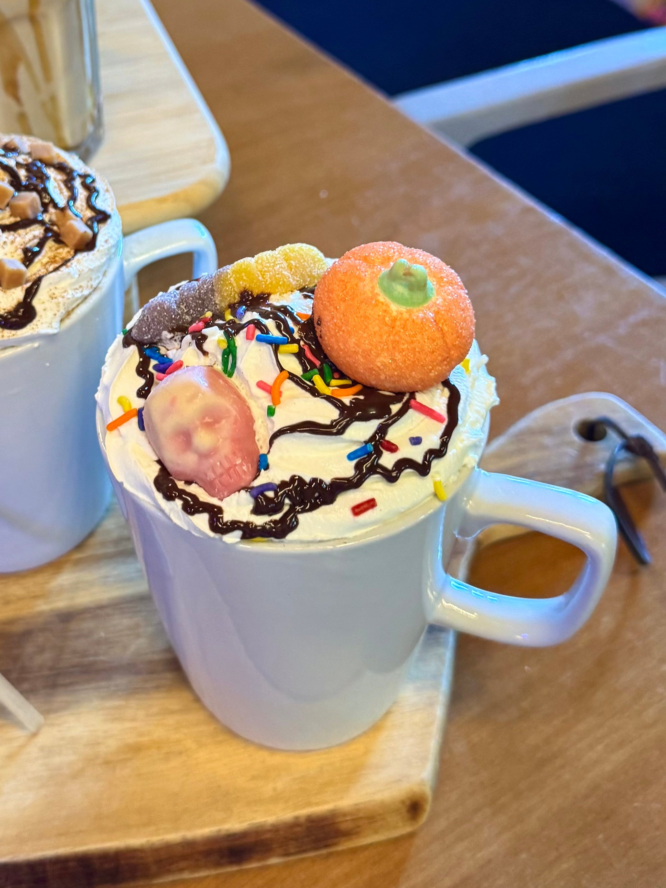 Strawberry candy flavoured hot chocolate topped with cream, chocolate sauce, rainbow sprinkles and halloween sweets!