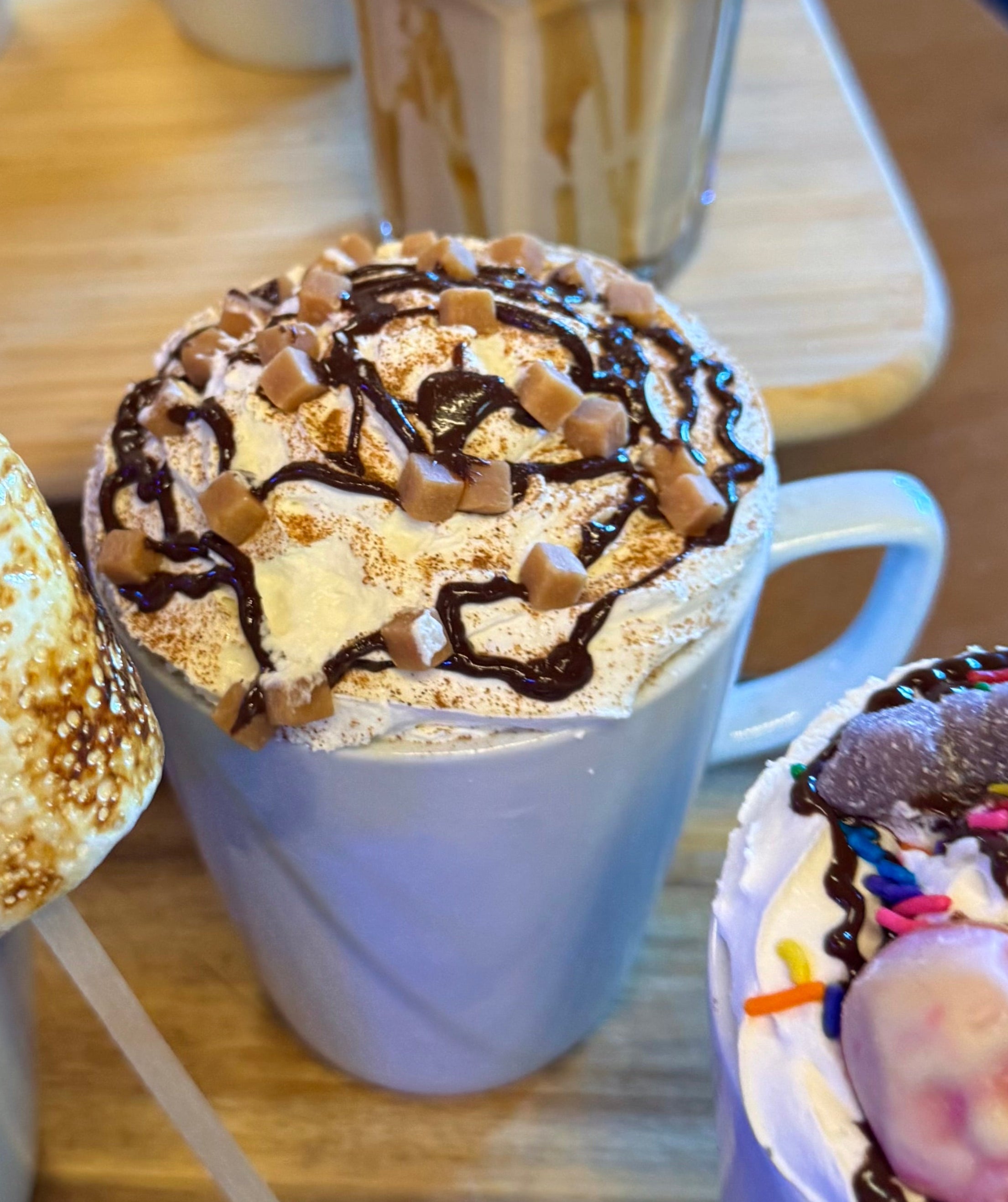 Cinnamon Bun flavoured Hot Chocolate topped with cream, chocolate sauce, cinnamon sprinkles and fudge pieces!