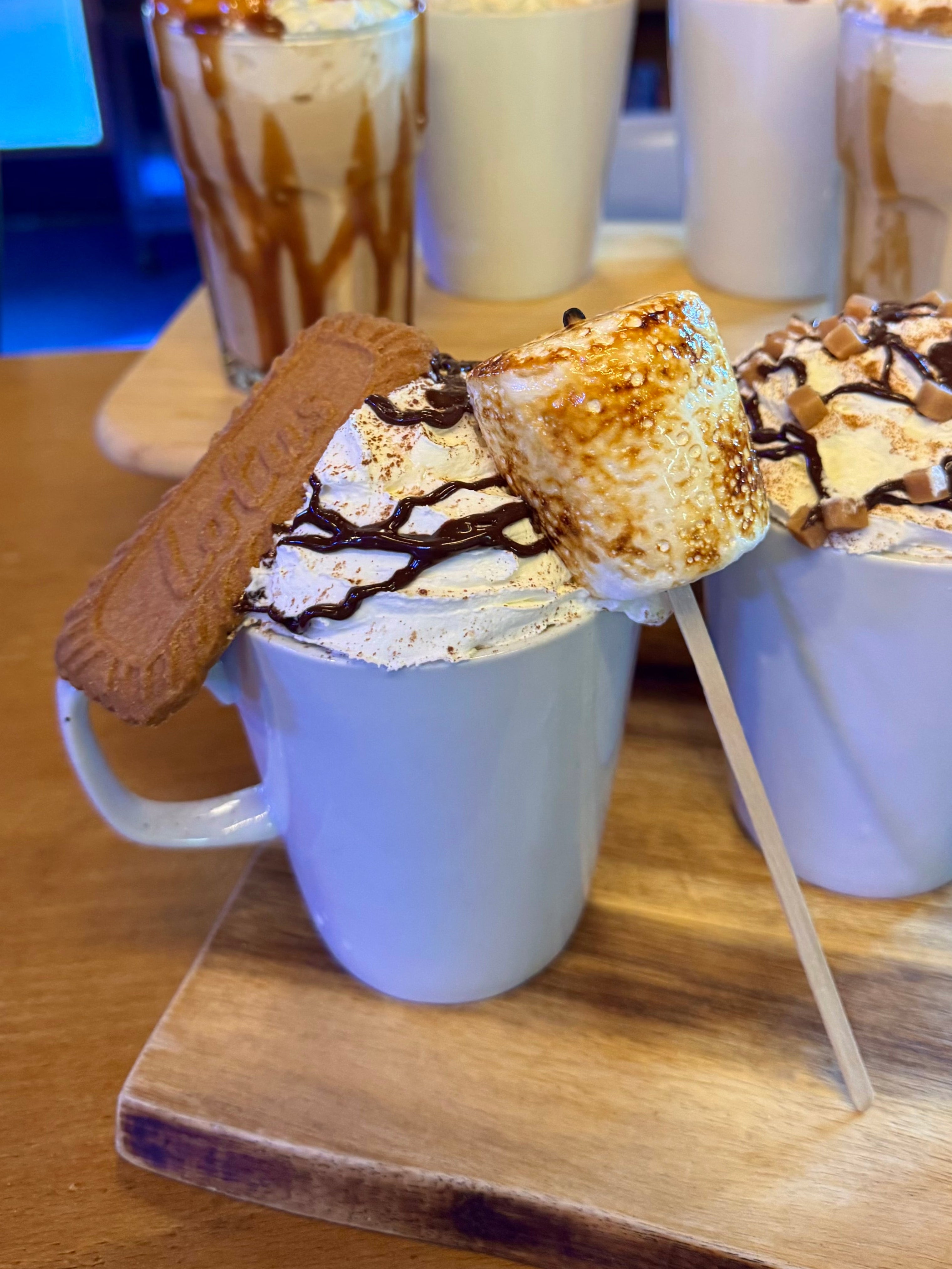 Toasted Marshmallow flavoured Hot Chocolate topped with cream, chocolate sauce, chocolate sprinkles, a giant Lotus Biscoff biscuit and a giant toasted marshmallow!