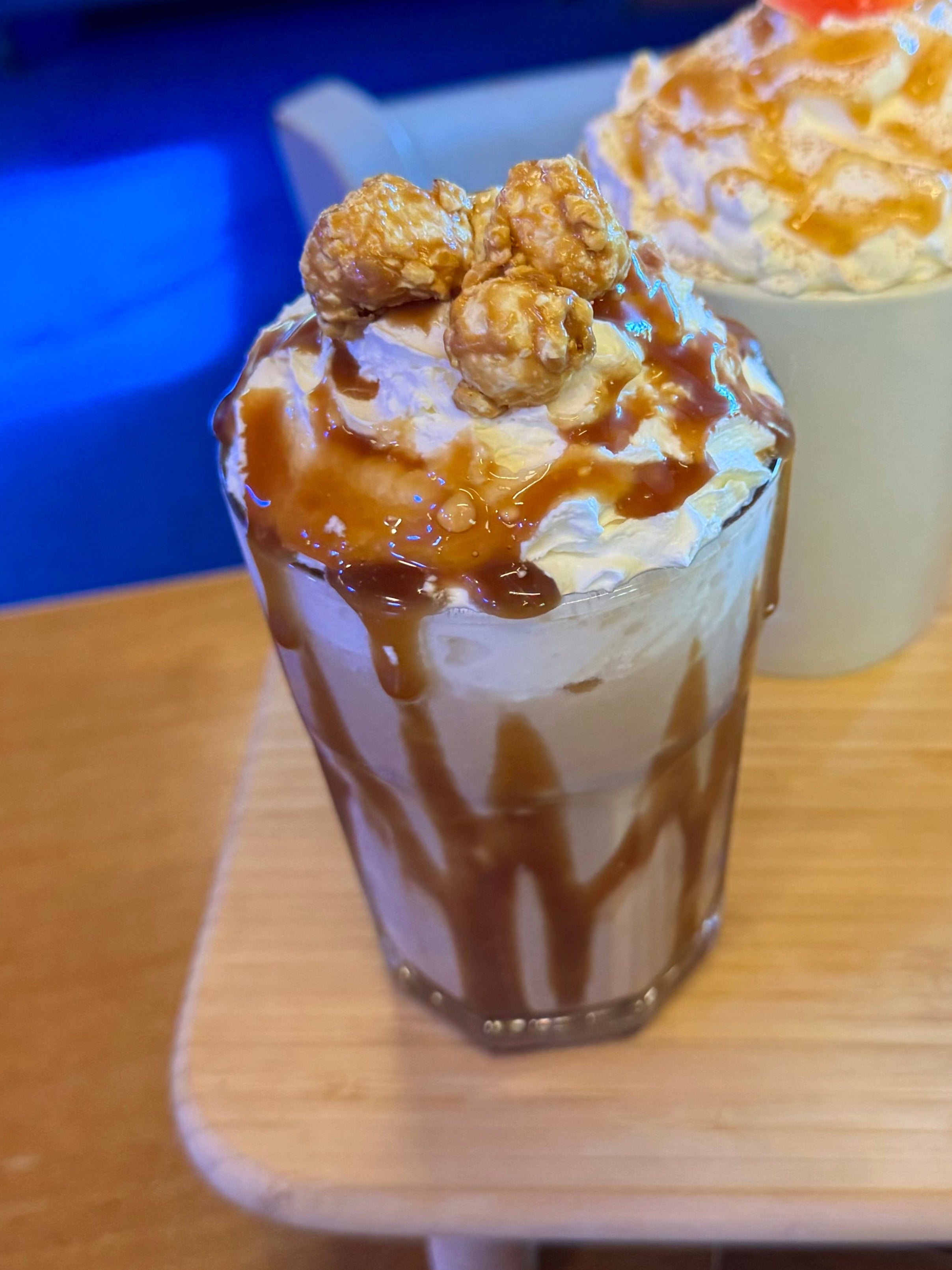 A Salted Caramel Popcorn flavoured Latte topped with cream, caramel sauce and salted caramel popcorn!