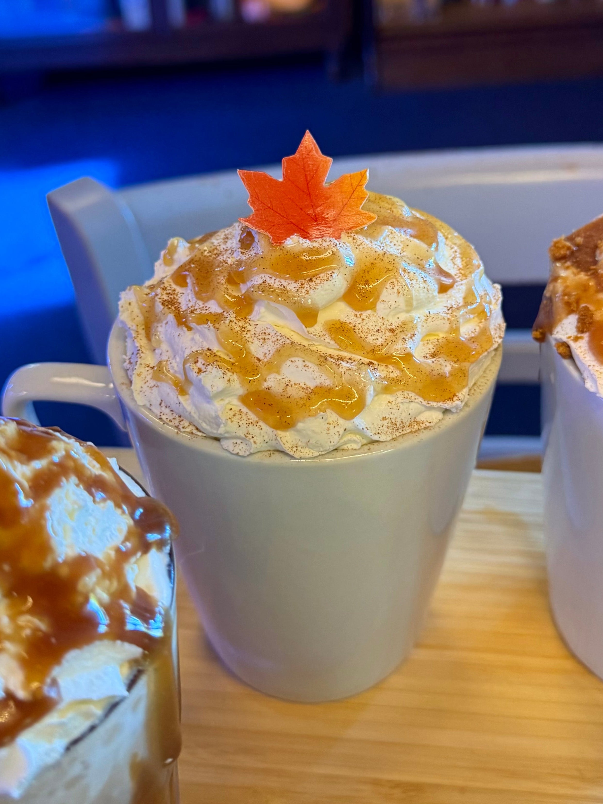 Maple Spice flavoured Latte topped with cream, maple spice sauce, cinnamon sprinkles and an edible maple leaf!