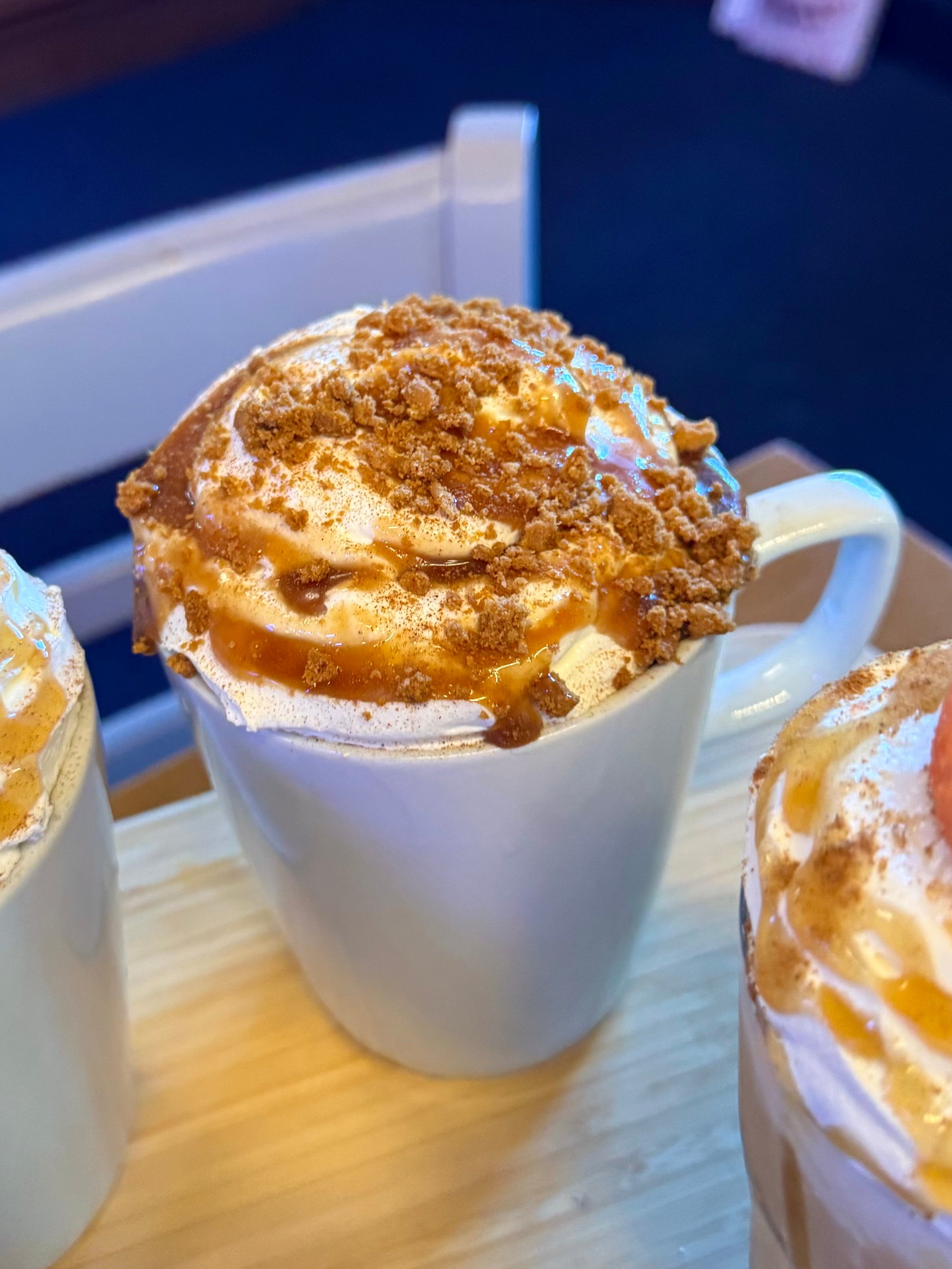Rhubarb Crumble flavoured Latte topped with cream, caramel sauce, cinnamon sprinkles and crushed Lotus Biscoff biscuits!
