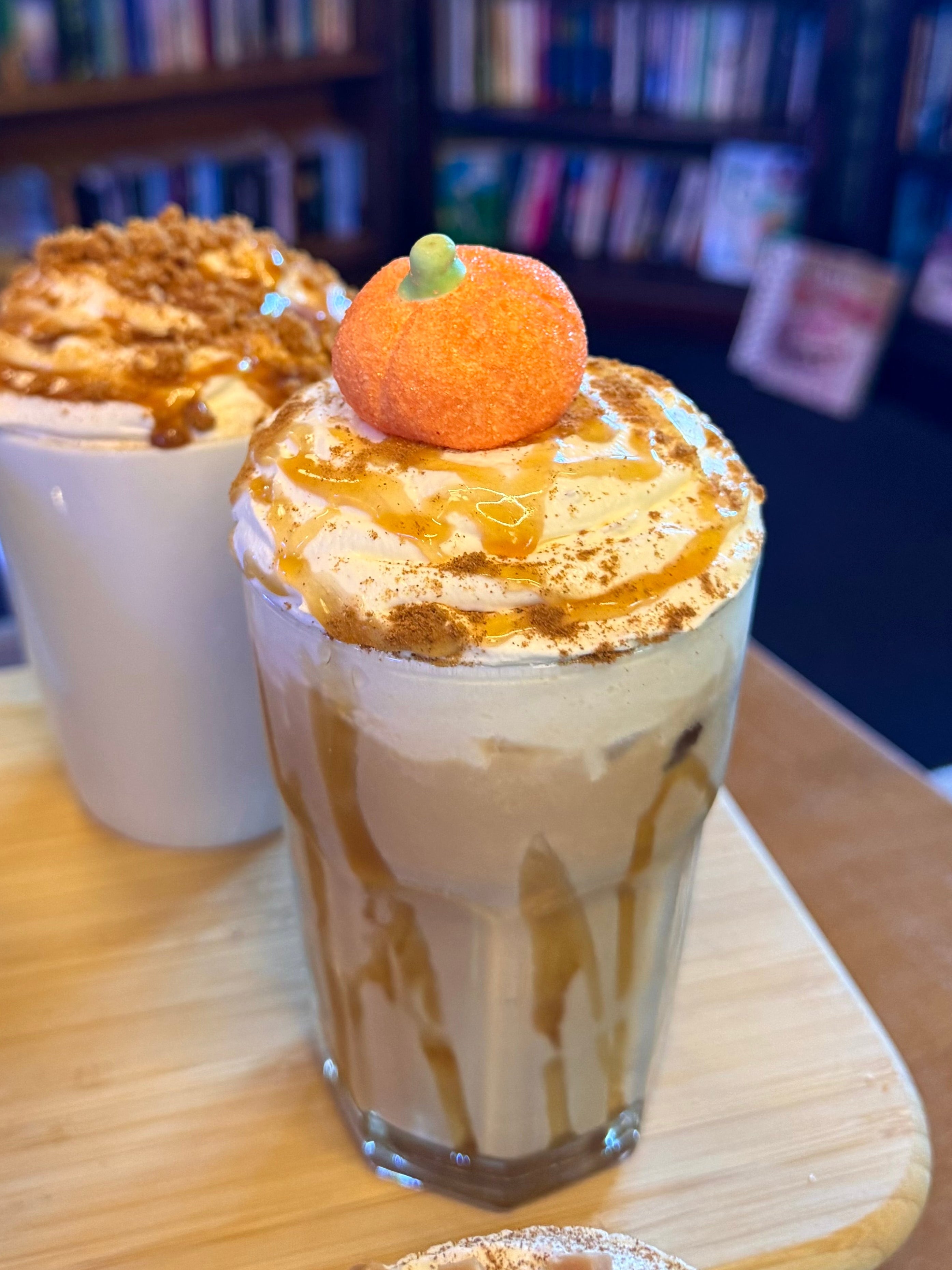 A Pumpkin Spice flavoured latte topped with cream, maple spice sauce, pumpkin spice sprinkles and a pumpkin marshmallow!