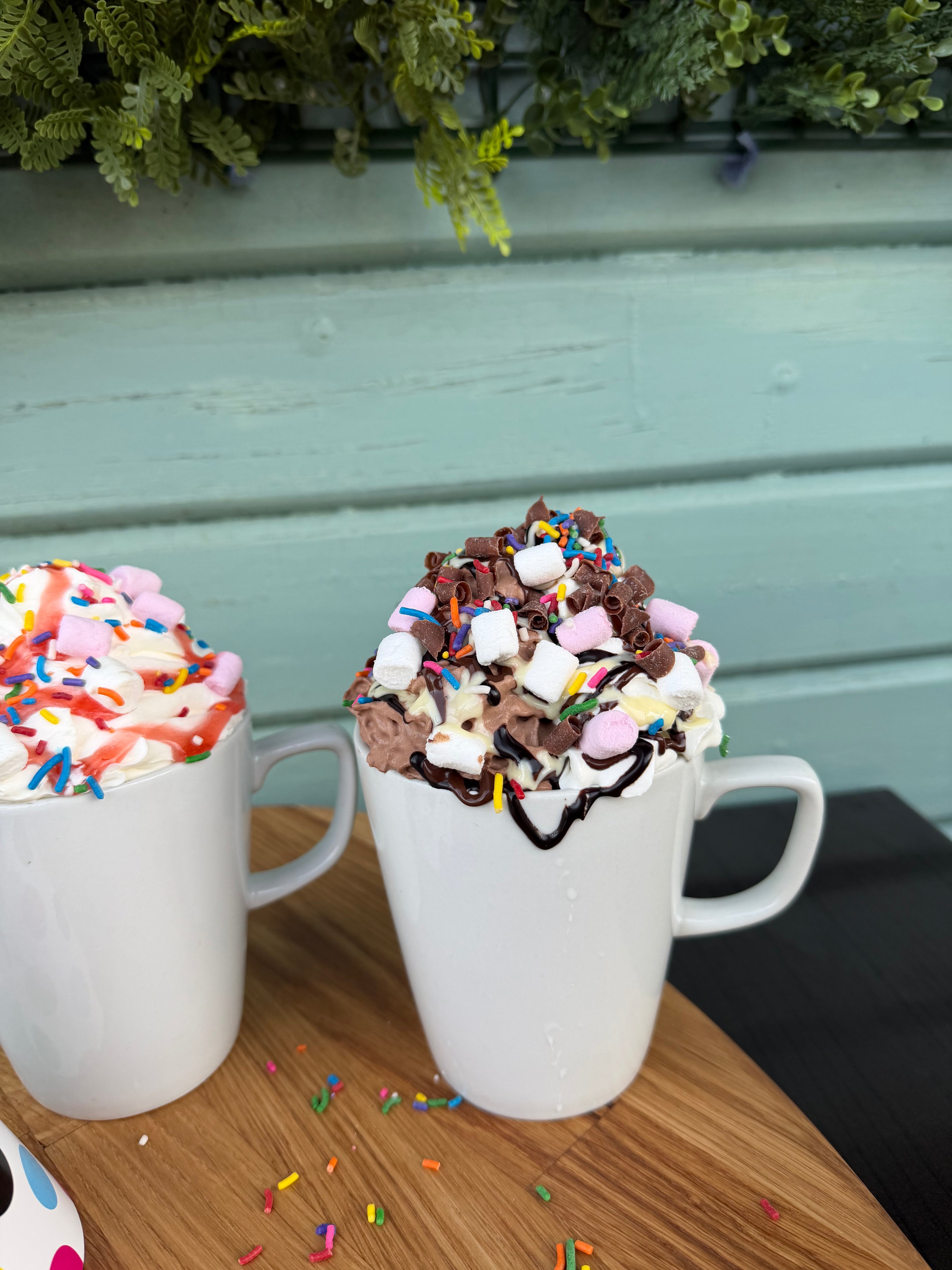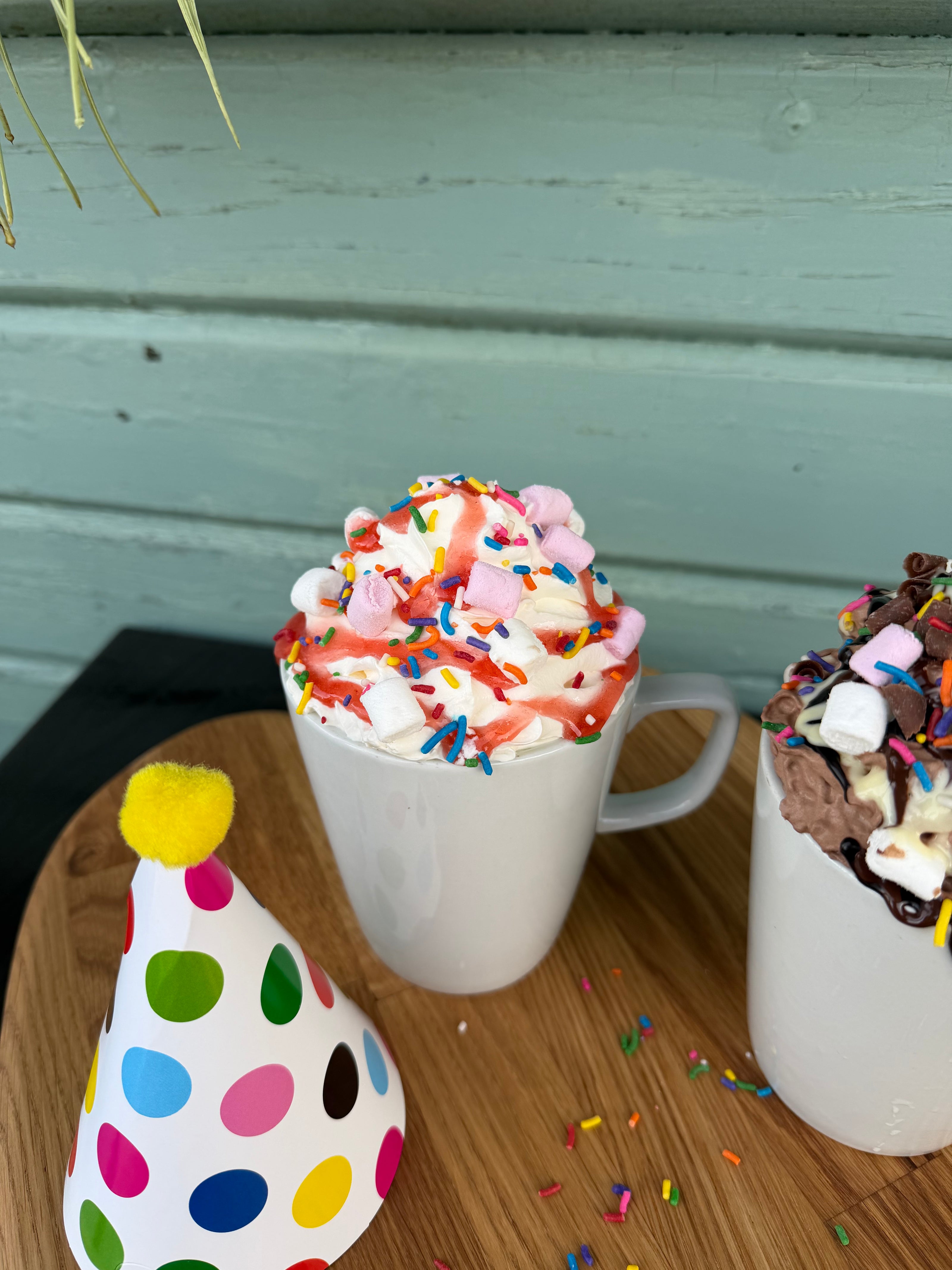 White and milk hot chocolate topped with regular and chocolate cream, triple chocolate sauce, chocolate curls, marshmallows and birthday sprinkles!