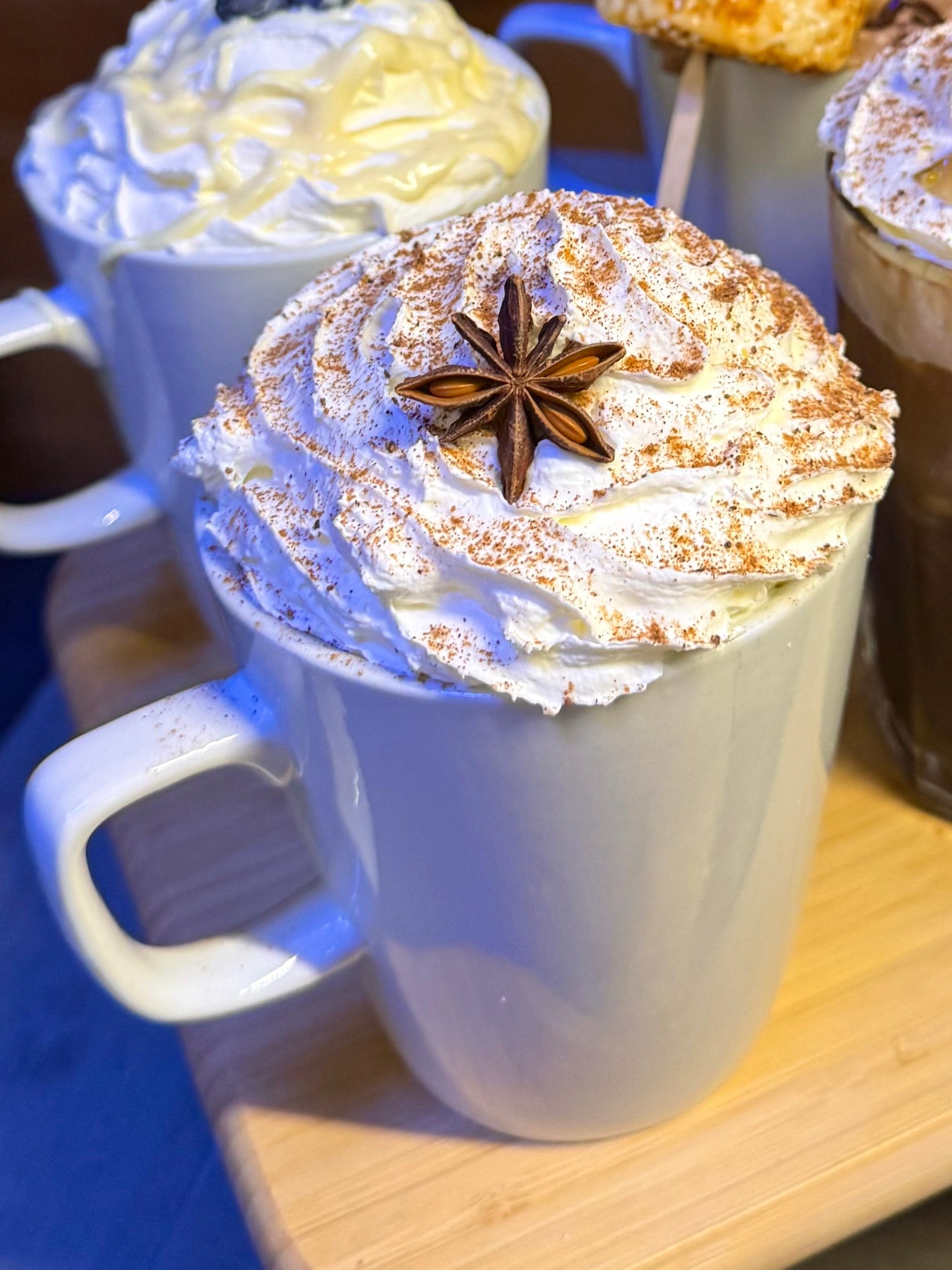 Eggnog flavoured latte topped with cream, cinnamon sprinkles, nutmeg & a star anise!