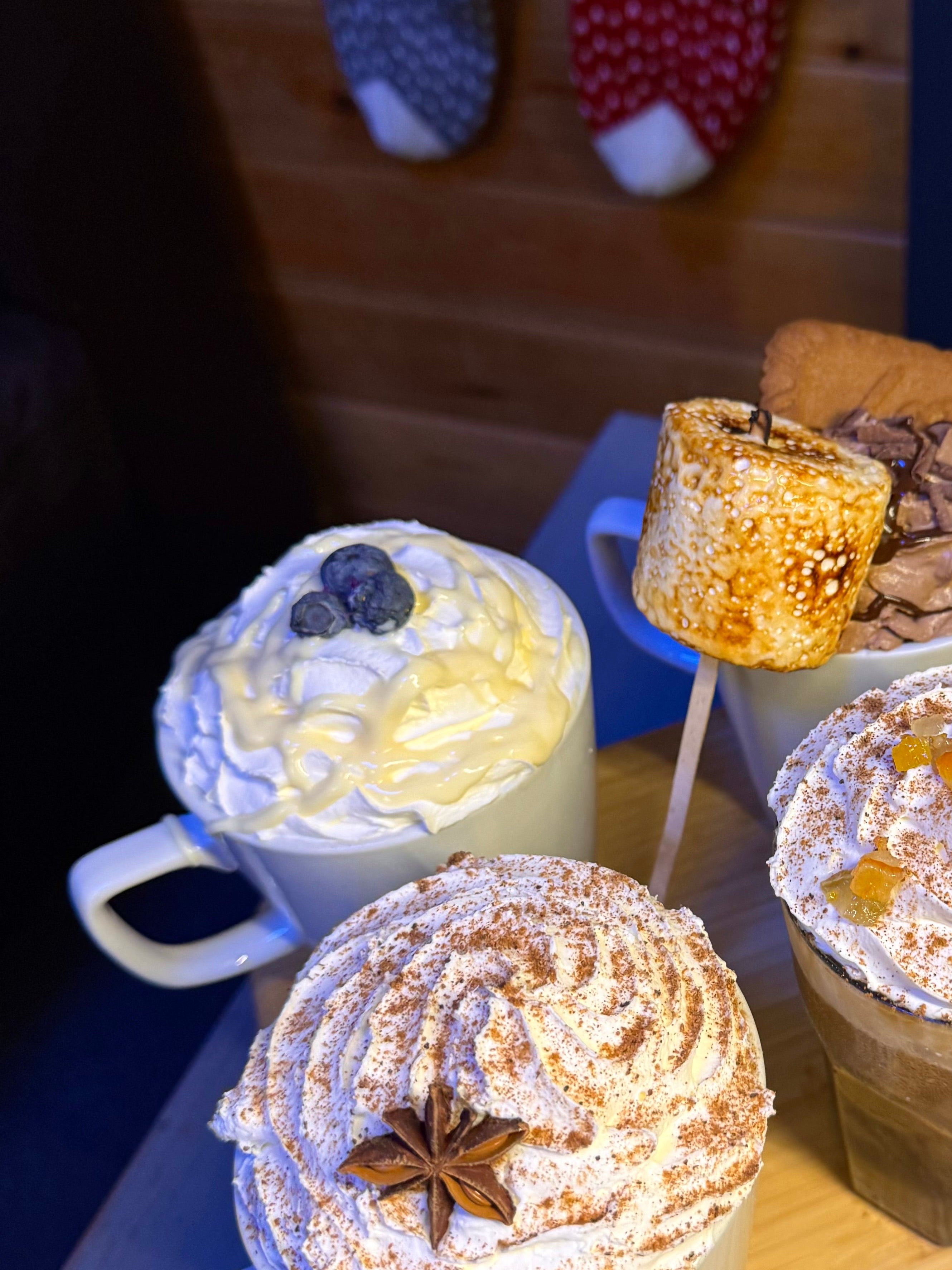 Blueberry flavoured white hot chocolate topped with cream, white chocolate sauce and freeze dried blueberries!