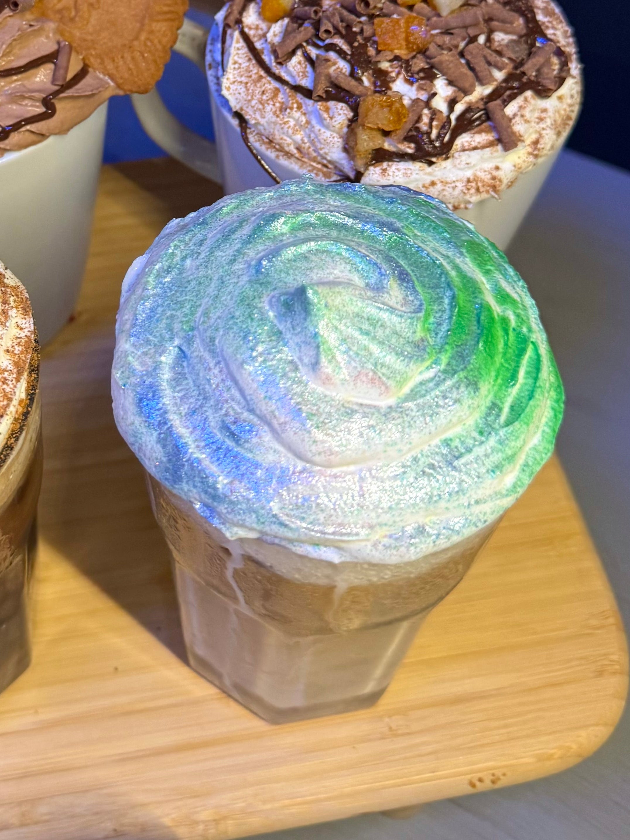 Winter spice flavoured latte topped with cream & edible glitter!