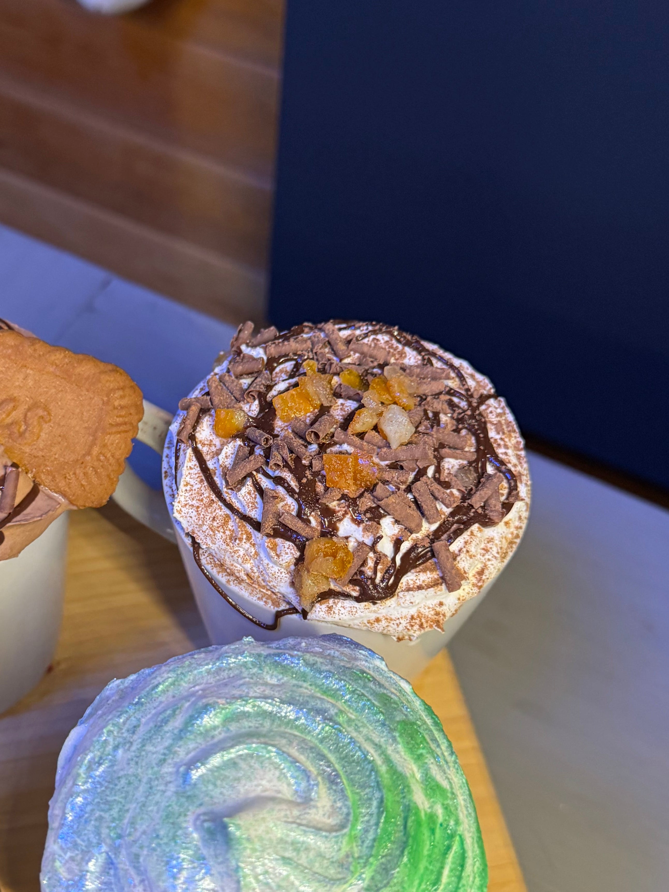Orange, cinnamon and vanilla flavoured hot chocolate topped with cream, cinnamon, chocolate sauce, chocolate swirls and candied peel!