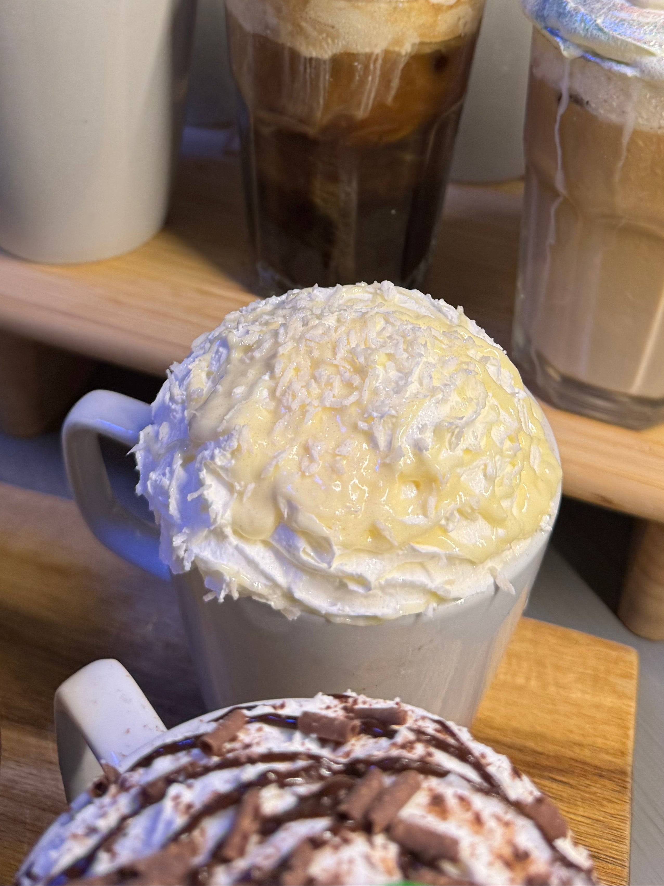 Coconut flavoured white mocha topped with cream, white chocolate sauce, coconut flakes and edible glitter!