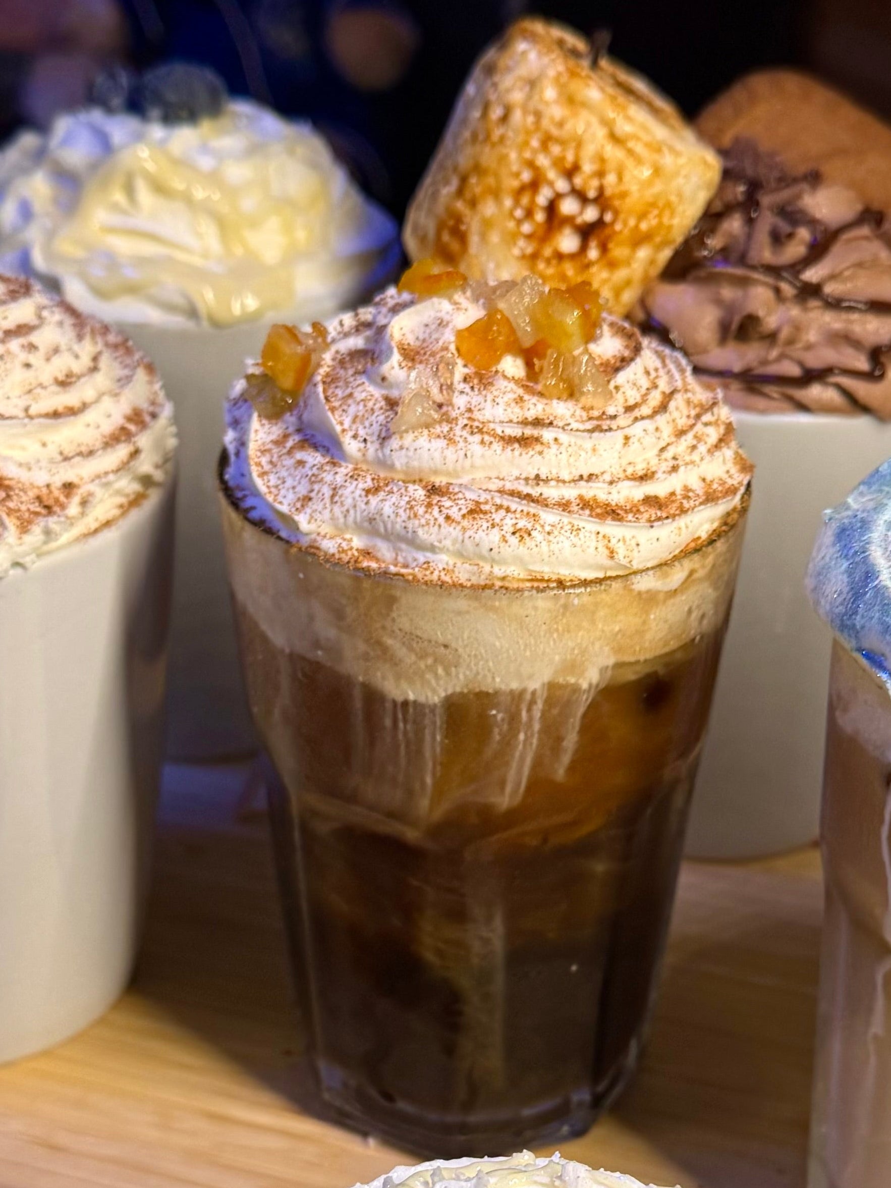 Orange & cinnamon flavoured iced americano topped with cream, cinnamon sprinkles, nutmeg and candied peel!