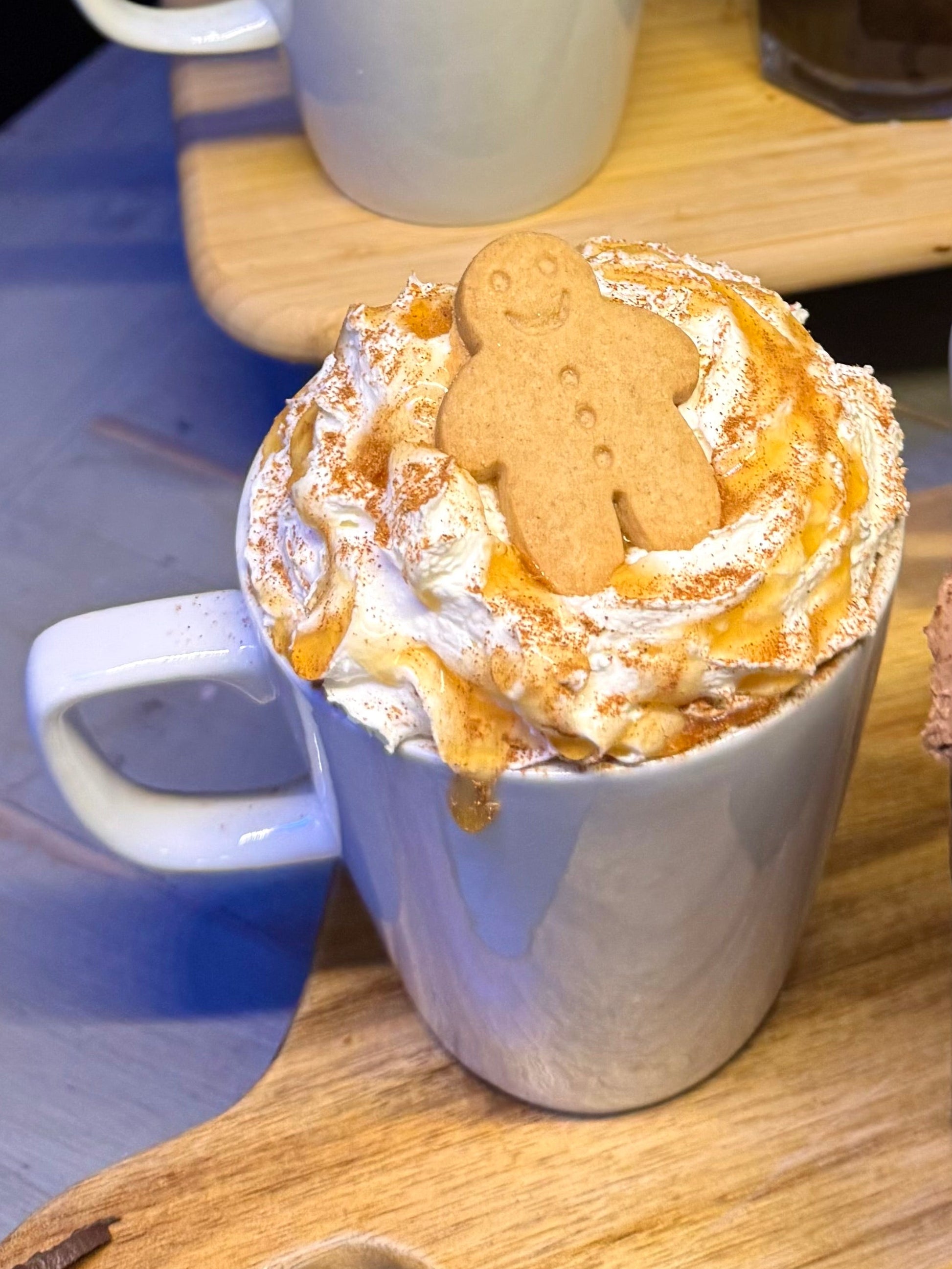 Gingerbread flavoured latte topped with cream, maple spice, cinnamon sprinkles and a mini gingerbread man!