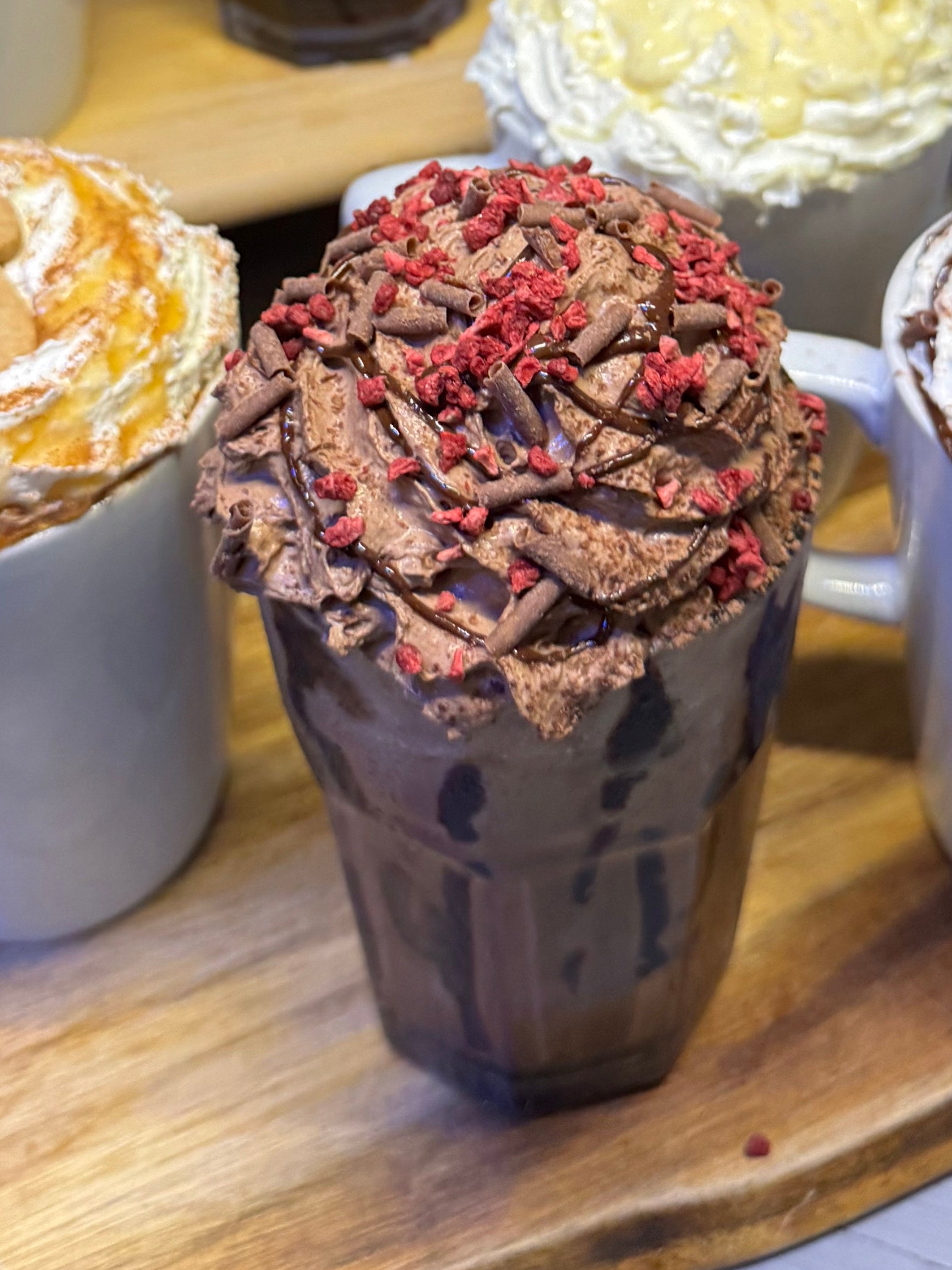 Black forest flavoured mocha topped with chocolate cream, chocolate sauce, chocolate swirls and freeze dried berries!