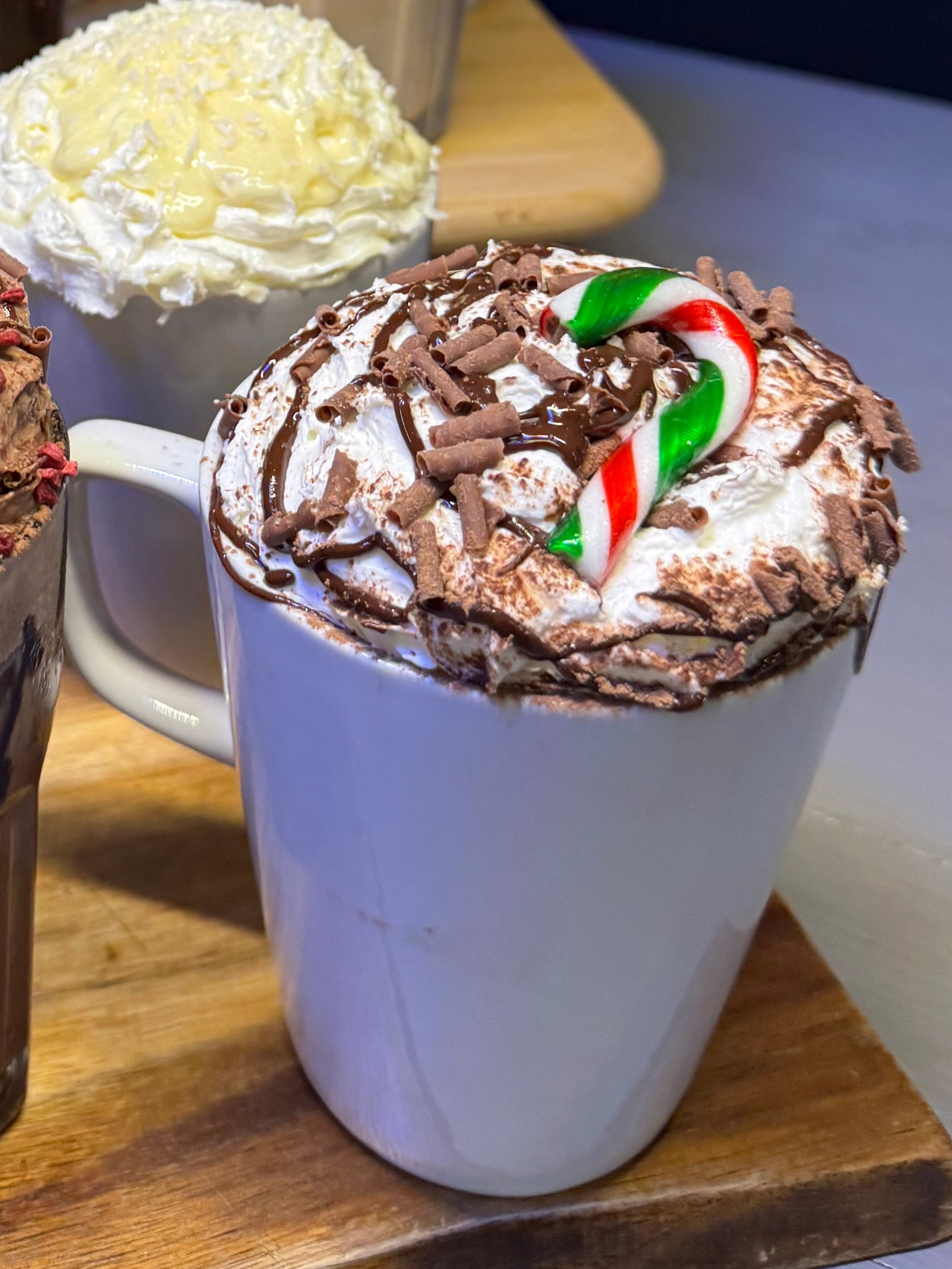 Sweet mint flavoured hot chocolate topped with cream, chocolate sauce, chocolate sprinkles, chocolate swirls and a mini candy cane!
